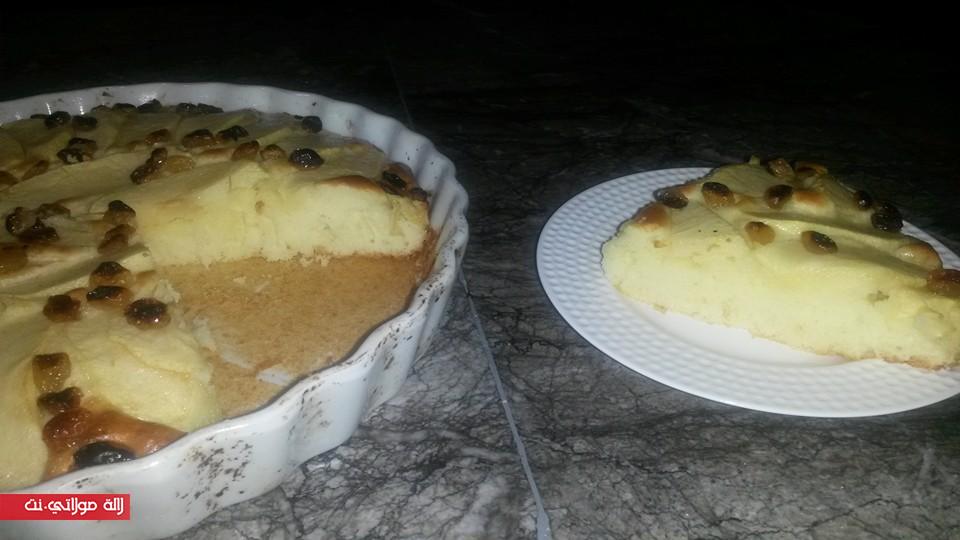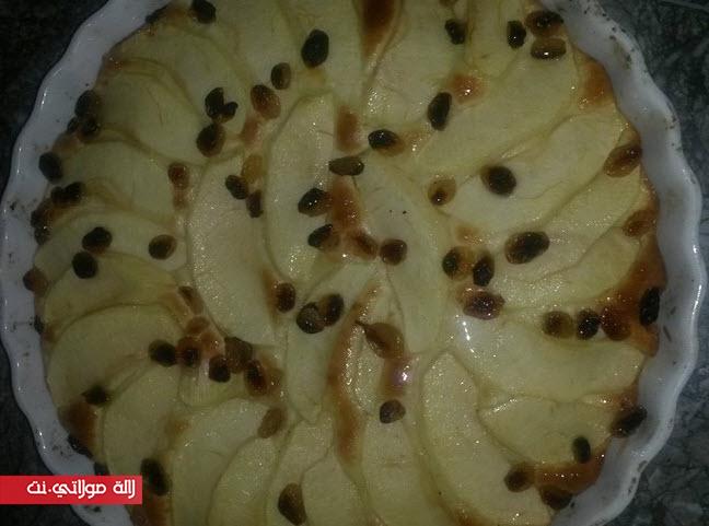 المهم يجي عاقد شوية ونصبوه فمول الفرن ونرتبو قطع للتفاح فوقو والزبيب ندخلوه للفرن درجة حرارة معتدلة ملي طيب