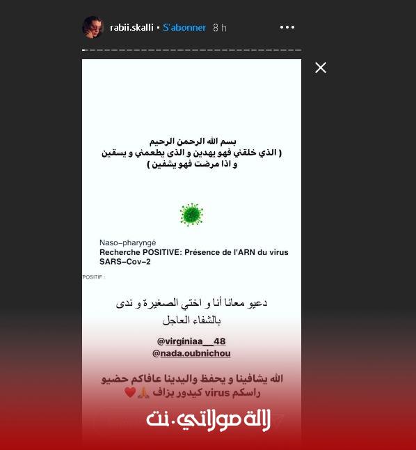 و أضاف ربيع :”دعيو معانا انا و اختي صغيرة و ندى بالشفاء العاجل ،الله يشافينا و يحفظ والدينا عفاكم حضيو راسكم الفيروس كيدور بزاف” .و بدورها نشرت الإعلامية ندى عبر حسابها في موقع انستقرام : “قمنا بإجراء التحاليل المخبرية و النتيجة كانت إيجابية دعواتكم معانا”،الله يشافينا و يشافي جميع المرضى و حضيو راسكم بالخصوص والديكم”.
