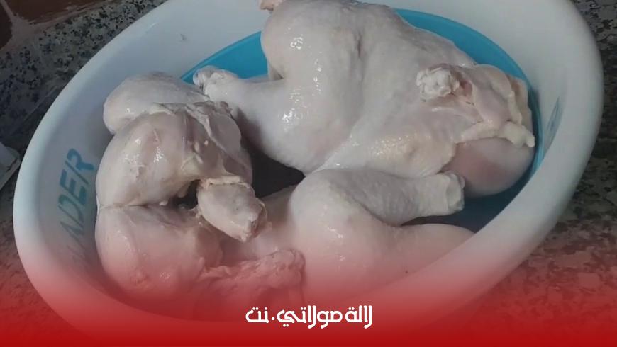 المكونات:الدجاج كميةٌ+كبيرة من ملح الطعام+كميةٌ قليلةٌ من الطحين+ماء و خل+غسل الدجاج: