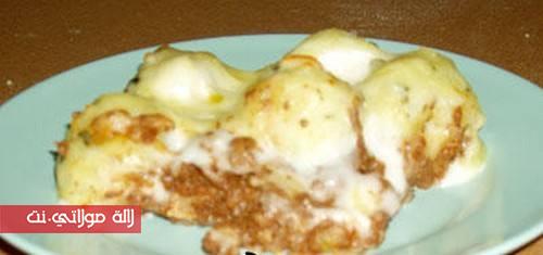 – في صينية نضع اللحم المفروم ثم نصب البشاميل فوقه، ثم نصف البطاطس فوق البشاميل.