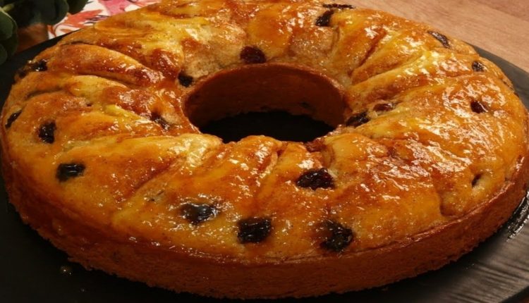 المقادير: 3 بيضات 1,5 علبة سكر 1 علبة ياغورث طبيعي – 110 غرام 1 علبة حليب 1 علبة زيت نباتية قشور البرتقال 5 علب دقيق الزبيب – العنب المجفف 1 تفاحة 2 كيس خميرة الحلويات 1 ملعقة كبيرة سكر قليل من القرفة قليل من السكر.