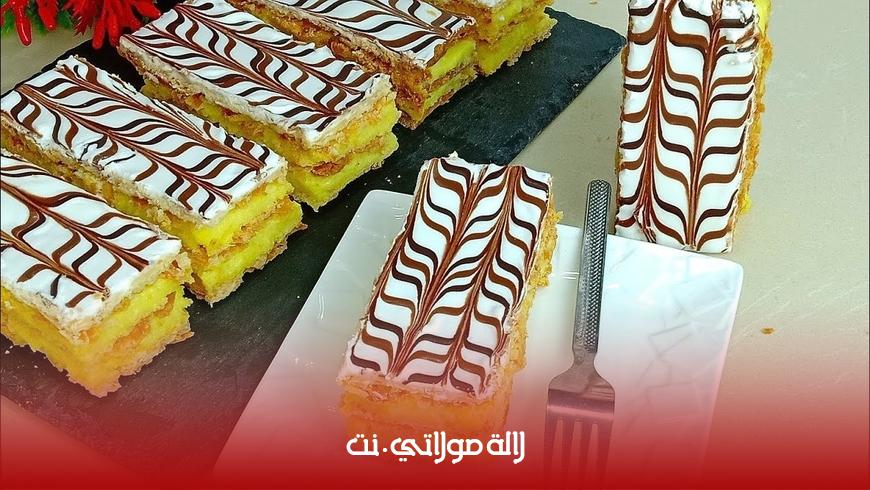 المكونات : 500 غ دقيق 400 غ زبدة خاصة بالتوريق 1 ملعقة كبيرة سكر نصف ملعقة ص ملح 50 مل زيت كريم باتسيير: 750 مل حليب 4 ملاعق كبيرة بودرة كريم باتسيير أو الكاسترد 4 ملاعق كبيرة سكر فوندون: بياض بيضة ملعقة صغيرة خل سكر ناعم.