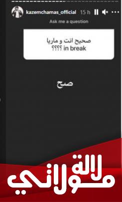 أعلن الفنان اللبناني كاظم شماس، زوج خريجة X factor المغربية ماريا نديم، انفصاله المؤقت عن زوجته، دون ذكر الأسباب.وكشف الفنان اللبناني خبر انفصاله، ردا على أحد متابعيه الذي سأله عن وضعية العلاقة بينه وبين زوجته المغربية، فأجاب أن علاقتهم الحالية متوقفة.