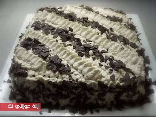 بعد ما تسقى بسيرو كندير فالوسط الكريم الشانتي و نسرحها و ندير الطبقة الثانية و نسقيها و ندير طبقة الكريم الشانتي و نبسطها و نغطي بيها الحلوى كاملة و كنزينها بالشكلاط شرائح و لكي نحصل عليه يذاب شكلاط مع قليل من زيت و يبسط على سطح رخامة و يتسرح طباقة رقيقة ثم نلفوه بسكين او سباتول على على شكل سكار