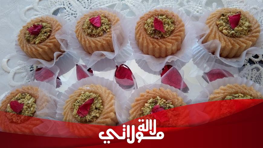 مكوّنات العجينة: كوب وربع من السميد الناعم+ ثلاثة أرباع كوب من الزبدة المذابة+أربع ملاعق صغيرة من السكر+ ربع ملعقة كبيرة من الملح+ فنجان من ماء الزهر الممزوج مع القليل من الماء+كوب وربع من السميد الخشن.