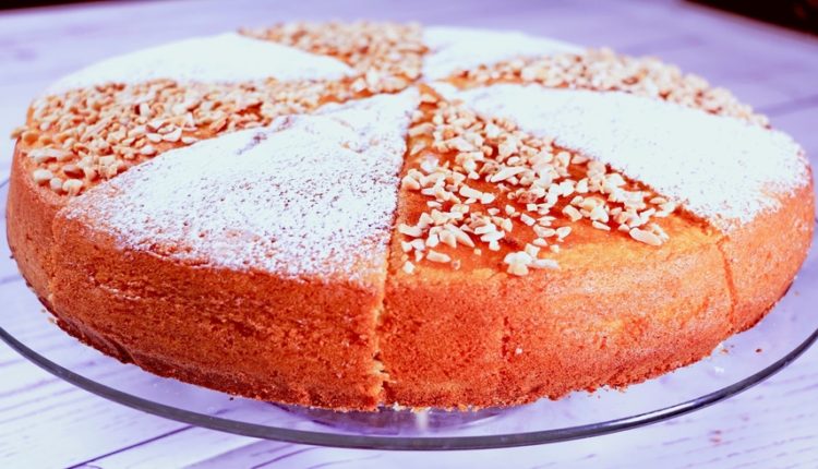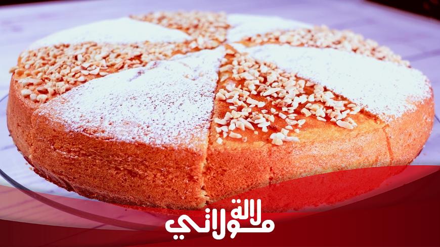 المكونات: كوب وربع من الطحين+ ربع ملعقة صغيرة من كل من الملح. كريمة التارتار+ ثلاثة أرباع كوب من كلٍ من عصير البرتقال الطازج+ طحين اللوز+ ملعقتان صغيرتان ونصف من البيكنج باودر+ ثلاث بيضات، مفصول البياض عن الصفار+ كوب ونصف من السكر+ نصف كوب من الزيت+بيضتان+ ملعقة صغيرة من كلٍ من: الفانيلا+ نكهة اللوز+بشر قشر برتقالتين+ سكر بودرة -للتزيين-.