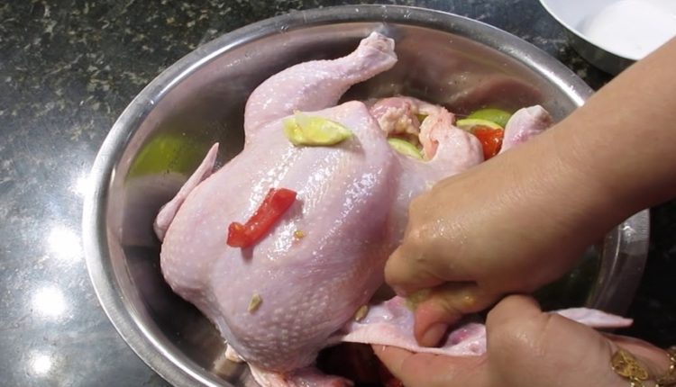 بعد أن تغسلي الدجاج بطريقتك المعتادة قومي بنقعه في كمية من المياه التي تضيفين لها عصير الليمون مع شرائح مقطعة أيضا من الليمون ثم ملعقتين من الخل ثم أضيفي له حبات من الإبزار وورق سيدنا موسى ثم المكون الإضافي ملعقة من الزنجبيل المطحون هذا يزيد الدجاج مذاقا لا قاوم .