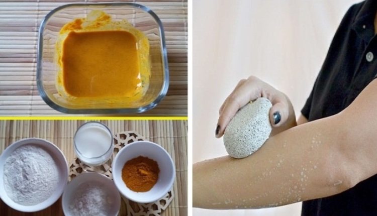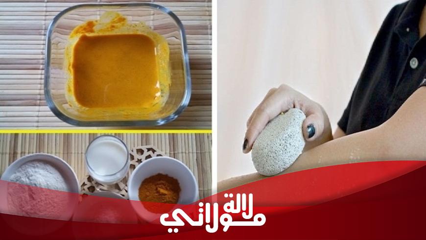 يمكنك أن تقومي بخلط ملعقة كبيرة من الكركم المطحون والناعم مع ملعقة من بيكاربونات الصودا و بياض بيضة واضعي القناع على المناطق التي ترغبين في إزالة الشعر منها واتركي إلى أن يجف ثم اشرعي في إزالته باتجاه عكس نمو الشعر وسترين أنه سيزول من الجذور كما أن القناع سيمنحك بياضا ناصعا في المناطق الحساسة.