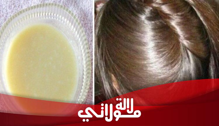 طريقة التحضير:توضع المكونات كلها في الخلاط وتطحن إلى أن تحصلي على خليط كريمي ذا لزم الأمر إضافة كمية من الحليب، ثم يبلل الشعر بالقليل من الماء ليصبح رطبا ويوضع الخليط على الشّعر من جذوره حتى أطرافه ويترك لحين الانتهاء من خطوات الاستحمام المعتادة. يغسل الشعر بالماء والشامبو جيد.