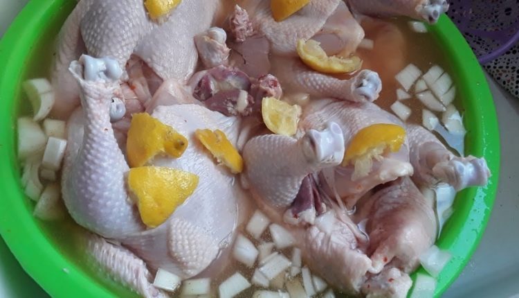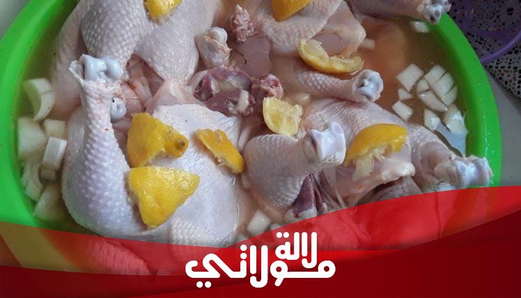 يمكنك سيدتي أن تقومي بتقطيع الدجاج إلى قطع صغيرة ثم ضعي عليك عصير حبتين من الطماطم وافركي جيدا قطع الدجاج بهذا العصير مع القليل من الملح وعصير الليمون الذي يساعد على إزالة الرائحة الكريهة التي تكون في الدجاج، كما أن عصير الطماطم يساهم بشكل كبير تسهيل عملية إزالة الجلد والشحوم وغيرها من الشوائب بعدها أزيلي الدجاج من ذلك الخليط واشطفي بالماء ثم انقعيه في الخل مع عصير الليمون والقليل من الفلفل الأسود وعصير حبة أخرى من الطماطم دون استعمال الماء واتركيه في الخليط إلى حين طهيه.