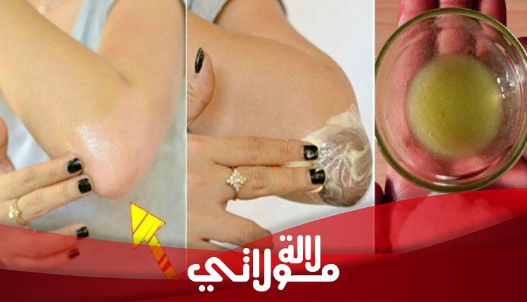اخلطي كمية قليلة من عصير الليمون مع ملعقة كبيرة من زيت الزيتون خلطاً جيداً، ثم ادهني به مناطق الركب والأكواع وذلك قبل ذهابكِ إلى النوم واشطفيه صباح اليوم الثاني بواسطة الماء، سترين أن هذه الوصفة ستمنحك ما تسعين إليه.