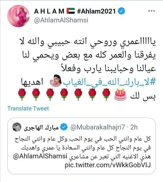 أهدى مبارك الهاجري زوج الفنانة الإماراتية أحلام الشامسي أغنيتها الجديدة لا بارك الله في الغياب لها بمناسبة عيد ميلادها اليوم.وأوضح مبارك الهاجري في تغريدة له على موقع التواصل الاجتماعي تويتر أن كلمات هذه الأغنية تصف مشاعره تجاهها.