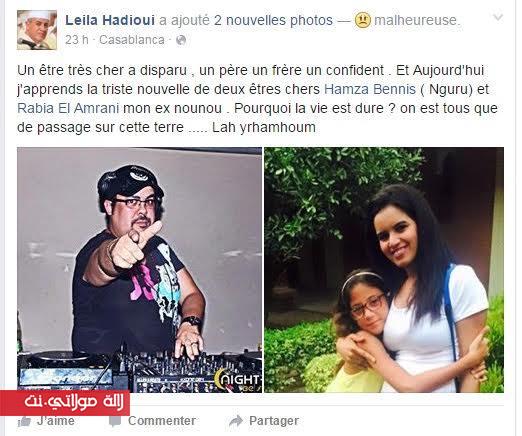 بعد وفاة والدها في فاجعة منى، قالت ليلى الحديوي في تدوينة عبر صفحتها بالفايسبوك، إنها فقدت شخصين عزيزين على قلبها هذا الأسبوع معبرة عن حزنها لما ألم بها. و نشرت العارضة المغربية صورتين الأولى، لصديقها الفنان حمزة بنيس الذي وافته المنية نهاية هذا الأسبوع والذي يكون زوج ابنة الفنان المغربي محمد الدرهم، كما نشرت ليلى صورة لمربية ابنتها الصغيرة ، ربيعة العمراني التي توفيت يوم أمس الأحد.