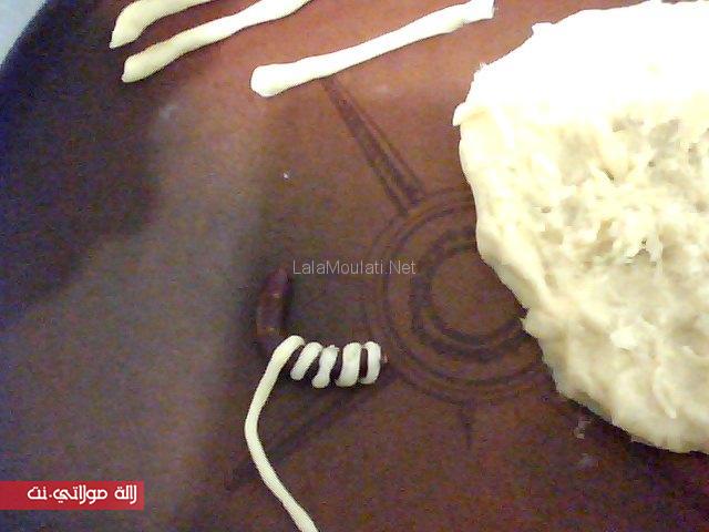 او ناخدو شوية العجين او نحربلوها تكون رقييييقة او ندوروها عليه باش تاخد الشكل ديال الدودة