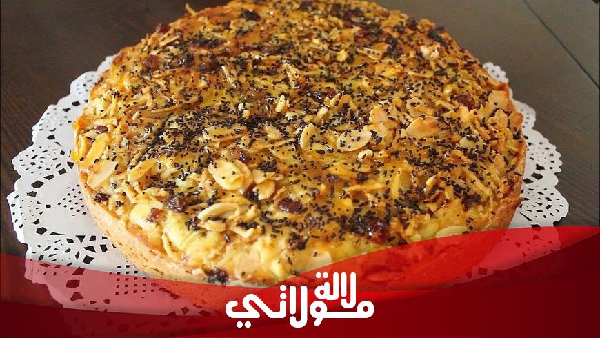 واستمري في الخفق لمدة دقيقتين. أضيفي خليط الدقيق تدريجيًّا، واستمري في الخفق حتى يذوب الدقيق تمامًا. صبي العجين في صينية مدهونة بالقليل من الزيت، ومرشوشة بالدقيق. وزعي اللوز المقشر على وجه العجين دون تقليب. ضعي الكيك في الفرن لمدة 45-50 دقيقة، ثم أخرجيه، واتركيه يبرد قليلًا قبل تقديمه.
