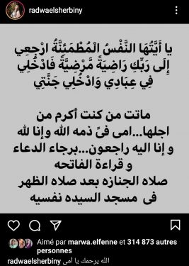 أما على حسابها الرسمي على موقع التواصل الاجتماعي إنستغرام، فكتبت الشربيني: “ماتت من كنت أكرم من أجلها، أمي في ذمة الله، إنا لله وإنا إليه راجعون.. برجاء الدعاء وقراءة الفاتحة”.وعن موعد تشييع جثمان الراحلة، قالت الإعلامية: “صلاة الجنازة بعد صلاة الظهر، في مسجد السيدة نفيسة”.