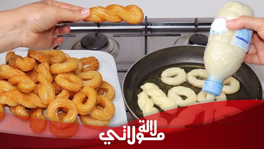 على سطح العمل نضغط على القنينة, ثم نشكلها على شكل خط طويل بدون تقطيع, ثم نلاقي نهاية كل خط, لتصبح لدينا دائرة, يمكنك تشكيلها بأي طريقة تريدين.بعد الانتهاء من كل كمية العجين, تقلى في زيت ساخن, يجب أن تكون المقلاة عميقة, حتى لا تتشرب الحلوى الزيت, بعد أن نقلي الكمية كلها, تزين اما بالسكر أو بالعسل بعد تسخينه, ثم تقدم مع الشاي بالصحة والعافية.