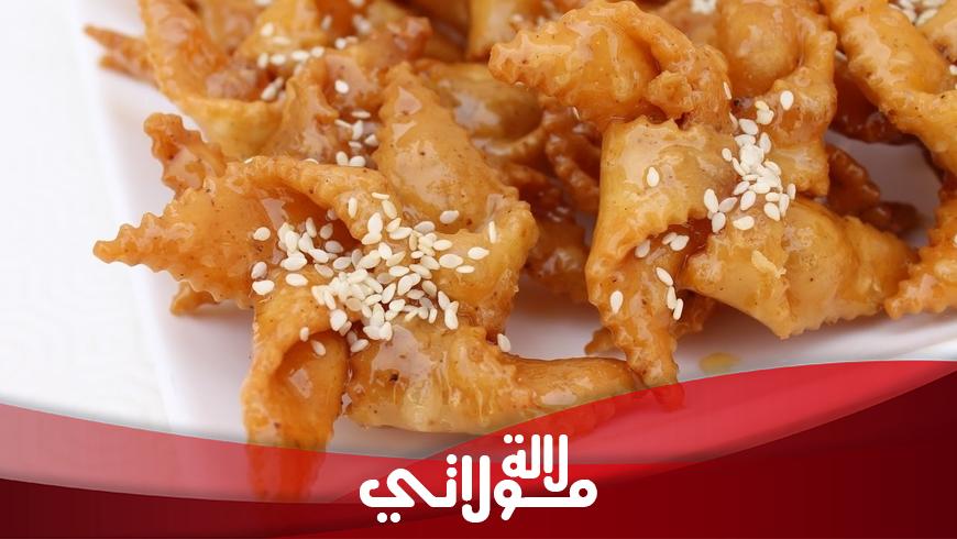 مقادير العجينة:500غرام دقيق ابيض+رشة ملح+2 ملاعق كبيرة ماء الزهر+2 ملاعق كبيرة نشا الذرة+ كاس غير مملوء زبدة مذابة+ كاس غير مملوء ماء+ابيض البيض للصق العجين+زيت للقلي