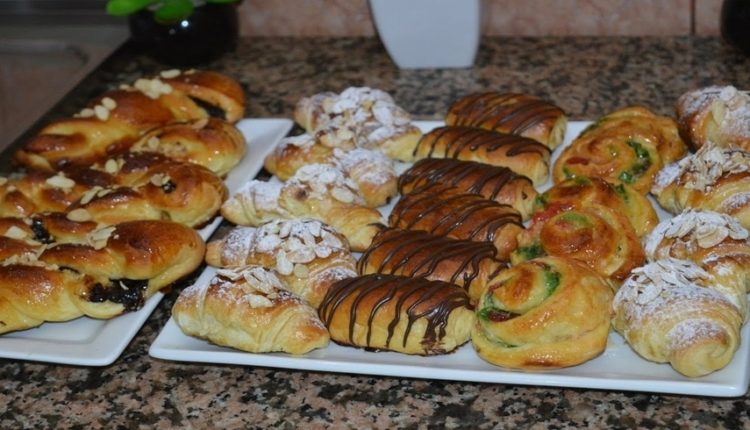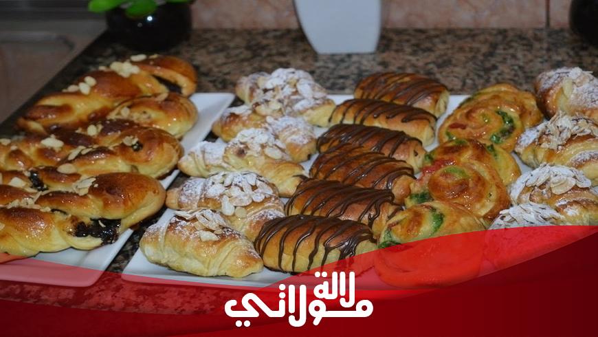 المقادير: ثلاثة أكواب وثلث الكوب من الدقيق+ كوب من الزبدة+ كوب من الحليب الدافئ+ربع كوب من الماء الدافئ+صفار بيضتان+ملعقتان صغيرتان وربع من الخميرة+ ملعقة كبيرة من السكر+ نصف ملعقة صغيرة من الملح+ زلال بيضة مخفوقة.