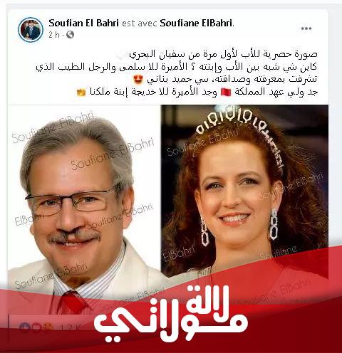 شارك الناشط الفيسبوكي سفيان البحري صورة تجمع الأميرة لالة سلمى بوالدها حميد بناني. وأرفق البحري صورة الأميرة لالة سلمى ووالدها بتدوينة جاء فيها “كاين شي شبه بين الأب وابنته ؟ الأميرة للا سلمى والرجل الطيب الذي تشرفت بمعرفته وصداقته، سي حميد بناني “.
