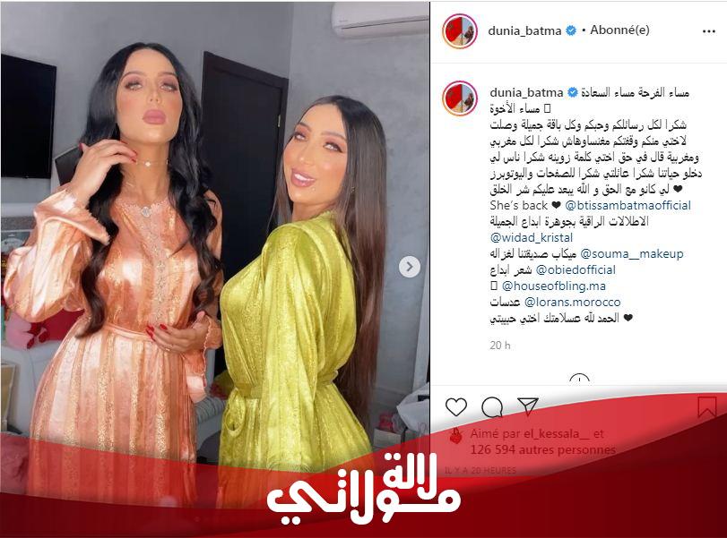 وعلقت بطمة على الفيديوهات قائلة: “مساء الفرحة مساء السعادة مساء الأخوة، شكرا لكم رسائلكم وحبكم وكل باقة جميلة وصلت لأختي منكم، ووقفتكم ما غنساوهاش”.