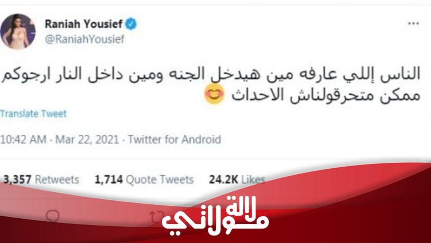 أثارت الفنانة المصرية، رانيا يوسف جدلًا واسعا، بسبب تغريدة نشرتها عبر حسابها الخاص بموقع التواصل الاجتماعي “تويتر”، تتحدث من خلالها عن الجنة والنار.