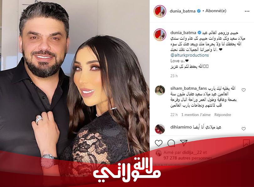 وجهت الفنانة دنيا بطمة إلى زوجها ومدير أعمالها البحريني، محمد الترك، رسالة رومانسية بمناسبة عيد ميلاده.ونشرت بطمة على صفحتها الرسمية على إنستغرام، صورة تجمعها بزوجها أرفقتها برسالة جاء فيها: « حبيبي وزوجي الغالي عيد ميلاد سعيد وكل عام وانت حبيبي كل عام وانت سندي ».