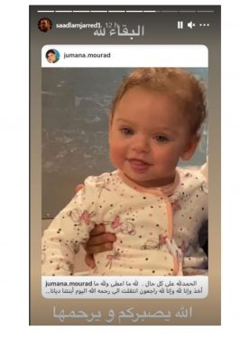 وبدوره، تفاعل النجم المغربي سعد المجرد مع رحيل ديانا، إذ أعاد نشر ستوري جومانا التي أعلنت عبره وفاة طفلتها، أرفقه بتعليق جاء فيه :”البقاء لله، الله يصبركم ويرحمها”.