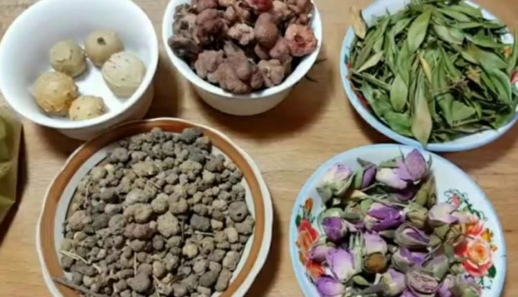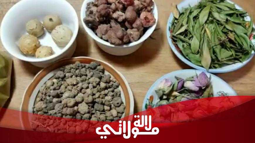 المكونات : كمية من عشبة تاكوت مطحونة + كمية من العرعار مطحون +كمية من الورد مطحون + اوراق الليمون الجافة والمطحونة+ كمية من مغلي الشاي