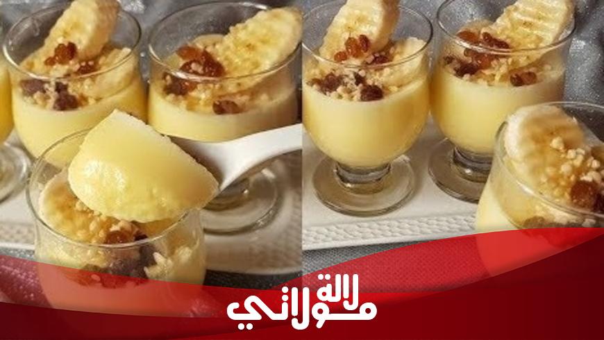 المكونات نصف لتر حليب علبة كريم كراميل محلاة ملعقة متوسطة سكر ملعقة كبيرة بودرة الكريم باتسيير تفاحة للتزيين موز زبيب لوز