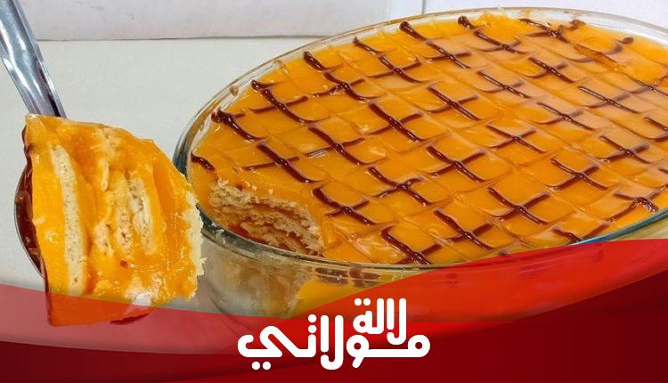 المكونات : نصف لتر عصير البرتقال 1 ملعقة كبيرة نشا 1 ملعقة كبيرة دقيق 1 فلان او كريم كراميل 3 ملاعق كبيرة سكر بسكويت حسب الحاجة .