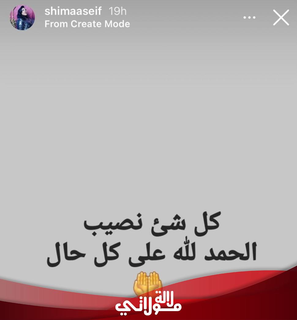 نشرت الفنانة المصرية الشابة شيماء سيف، رساله غامضة عقب الغاء متابعة زوجها حيث كتبت على خاصية الأستورى على صفحتها الشخصية بموقع الصور “انستغرام”:”كل شيءٍ نصيب الحمد لله على كل حال” دون توضيح أي معنى لهذه الرسالة التي جاءت بعد الغاء متابعة زوجها، الأمر الذي أثار جدلا بين جمهور ومتابعي الفنانة حيث تداول البعض عبر مواقع التواصل الاجتماعي، أنباء عن انفصالها عن زوجها.