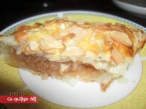 يطلق العجين على شكل مستطيل رقيق تم يتقب بالشوكة كنعصر التفاح من داك الماء ديالو وكنوضعوه فوق العجين تم نلف العجين و تذهن بالبيض و ترش برقائق اللوز و تطهى في فرن معتدل الحرارة تم تقدم يمكننا تقديمها دافئة أو باردة
