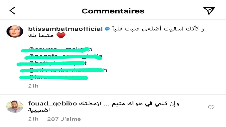 وأثارت منشورات وتدوينات لقبيبو وابتسام بطمة على حسابيهما على إنستغرام، شكوك متابعيهما.وفي أحدث صورة تقاسمتها مع متابعي حسابها الرسمي على إنستغرام، لمحت ابتسام بطمة في تعليقها على الأخيرة، أنها تعيش قصة حب.