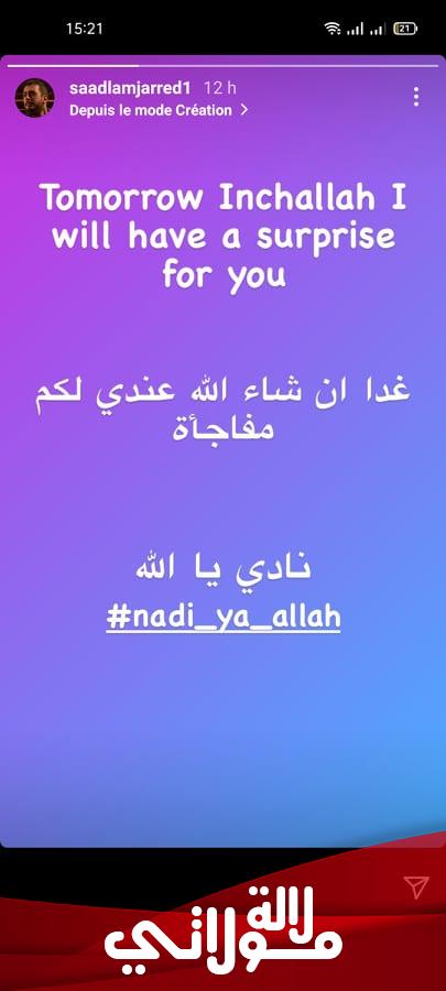 وقال “المعلم” في تدوينة على شكل “سطوري” بحسابه الرسمي على “الأنستغرام” : “غدا إن شاء الله عندي لكن مفاجأة”.