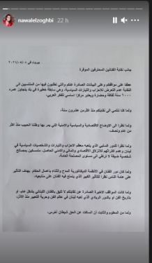 وأضافت نوال الزغبي :”من المعلوم والثابت أن الساكت عن الحق شيطان أخرس… ولما لا يشرفني أن أرى وطني الحبيب وأبناء وطني ينزلقون نحو مستقبل مجهول وأنا مكتوفة اليدين، لذلك أتقدم من نقابة الفنانين المحترفين في لبنان باستقالتي لهذه الأسباب”.