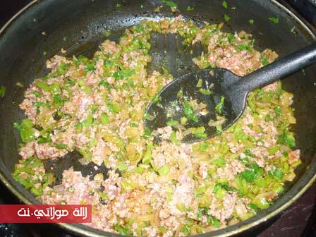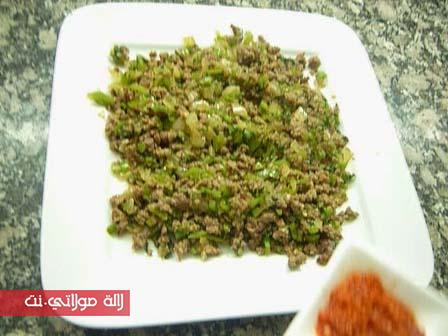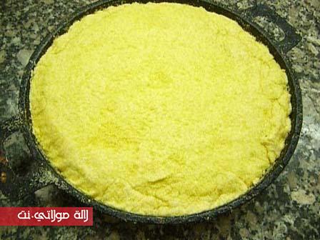 نأخد صفيحة دائرية ندهنها بالزيت ونرشها جيدا بالسميد