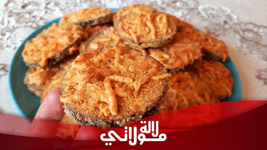 المقادير:حبات بادنجان مقطعة دوائر+كمية من الشابلير (بقسماط)+كمية من دقيق الفينو+كمية من دقيق الذرة+ 2حبات بيض