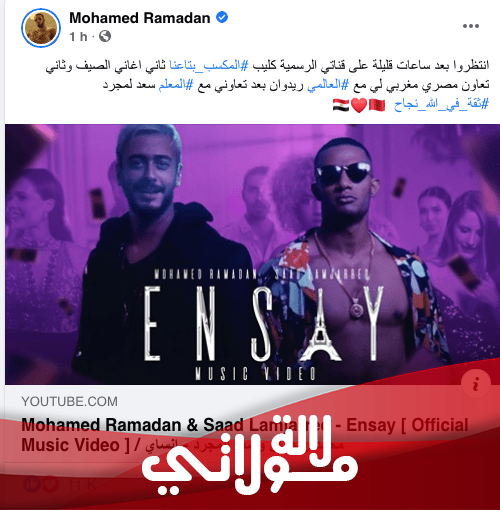 ونشر الفنان المصري محمد رمضان رابط أغنية إنساي عبر حسابه الرسمي على موقع “فايسبوك”، في إشارة منه إلى نهاية الخلاف بينه وبين النجم المغربي سعد لمجرد.