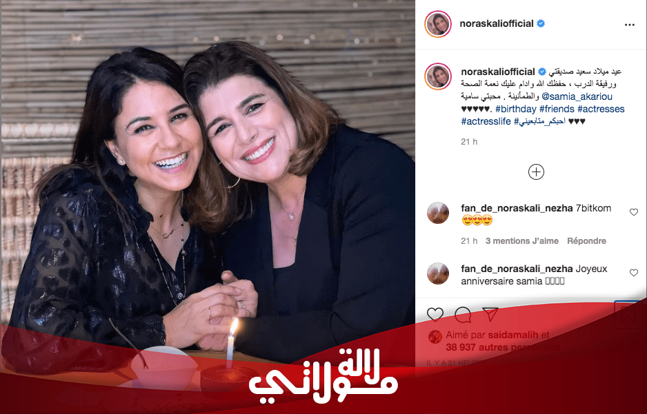 نورة الصقلي نشرت صورة لها رفقة صديقتها الفنانة سامية أقريو على حائط حسابها، وأرفقتها بتعليق كتبت فيه: “عيد ميلاد سعيد صديقتي ورفيقة الدرب ، حفظك الله وادام عليك نعمة الصحة والطمأنينة . محبتي سامية”.