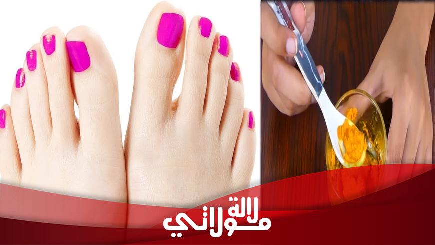 خذي سيدتي كمية من الكركم البلدي واخلطيه بعصير الليمون الحامض والقليل من بيكاربونات الصودا واخلطي جيدا ثم طبقي الوصفة على اقدامك واتركيها إلى أن تجف بعدها افركي جيدا اقدامك بالماء الدافئ وسترين النتيجة التي ستحصلين عليها في الحين.