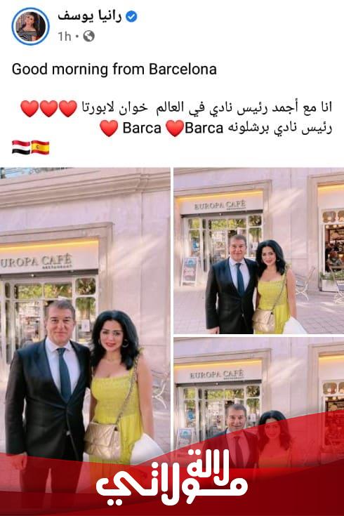 فوجئت الفنانة المصرية رانيا يوسف بهجوم شُنّ عليها بعد نشرها صورة جمعتها مع رئيس نادي برشلونة الإسباني وعلّقت عليها قائلةً: “صباح الخير من برشلونة، أنا مع أجمد رئيس نادي في العالم، خوان لابورتا”.