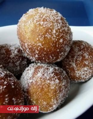 نذيب الزبدة في وعاء صغير على نار هادئة. نضع الدقيق بشكل نافورة مع رشة ملح، 200 غ سكر و قشر الليمون المبشور. نفقس في المنتصف البيض ثم نضيف الزبدة دافئة، الحليب و الخميرة. نعجن مبتدئين من المنتصف باستخدام شوكة ثم بالأيدي حتى نحصل على خليط صلب و متجانس. نأخذ من العجينة قطعة و نصنع منها شكل أسطواني بقطر 2 سم ثم نقطعه و نصنع من كل قطعة قرص مستدير باستخدام الأيدي و نكرر العملية حتى ننتهي من الكمية كلها. نقلي الكرات بما يكفي من الزيت الساخن على دفعات حتى تتحمر بشكل متساوي ثم نصفيها و نمررها بالسكر حتى تتغطى بالكامل. تقدم ساخنة أو باردة مع الصلصة المعدة. * * نخفق 4 من صفار البيض و 4 ملاعق سكر و عصير التفاح بعد طهيها بطريقة التغطيس.