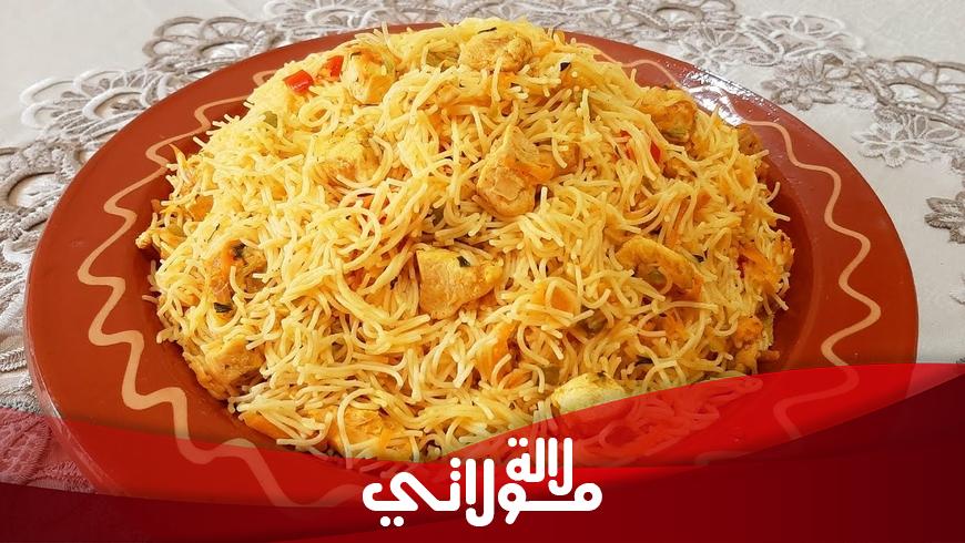 المقادير:نصف كيلو سفة شعرية+ 3 ملاعق كبيرة زيت نباتية+ملعقة كبيرة زبدة بلدية+بصلة مقطعة مربعات صغيرة+ فص ثوم مفروم+صدر الدجاج مقطع مربعات (حسب الرغبة)+ حبة فلفل أخضر مقطع مربعات+حبة فلفل أحمر مقطع مربعات+حبات قرع أخضر محكوك+حبات جزر محكوك+ملاعق كبيرة قزبرة ومعدنوس مفرومين+التوابل: فلفل أسود – زنجبيل – كركم – فلفل أحمر+ملح