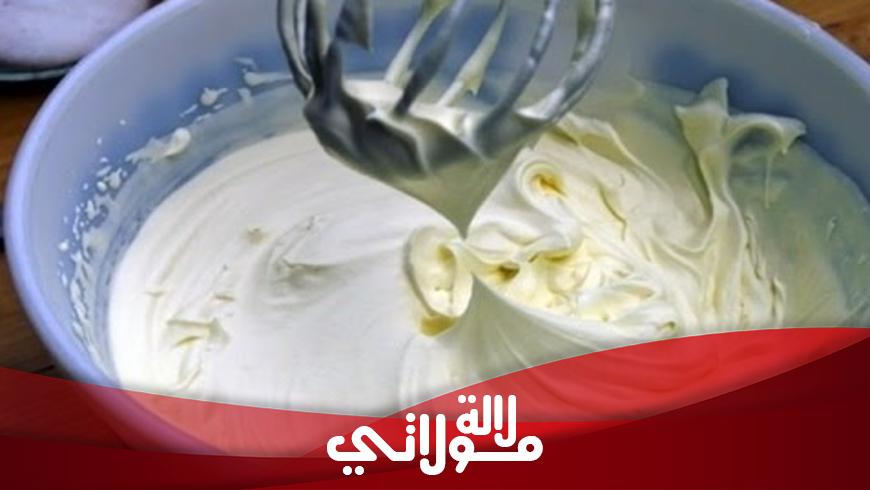 يمكنك سيدتي أن تعتمدي المكونات التالية كوب من السكر الناعم المطحون جيدا و بياض بيضتين و ملعقة كبيرة من عصير الليمون وملعقة من الفانيلا إضافة إلى ملعقة صغيرة من الخل الأبيض وهو ما يساهم في نجاح الكريمة مائة في المائة، بعدها قومي سيدتي بوضع كل من السكر، والفانيلا، وعصير الليمون، وبياض البيضتين والخل في وعاء الخلاط الكهربائي و يستمر خلط هذه المكونات في الخلاط مدة خمس دقائق حتى تتكاثف جيدا وتصبح مثل الرغوة البيضاء وهي الكريمة التي يمكنك الاحتفاظ بها مدة طويلة في الثلاجة كونها تحتوي على الخل الذي يساهم في ذلك.