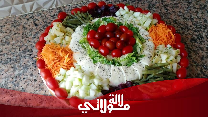 من مطبخ هاجر أم توأم /المقادير: أرز أبيض جزر خيار بطاطس شمندر(باربا) طماطم صغيرة الفاصوليا الخضراء (اللوبيا) خس فلافل الوان جبن السندويش علبة التونة مايونيز ملح،كمون زيت الزيتون قزبر وبقدونس.
