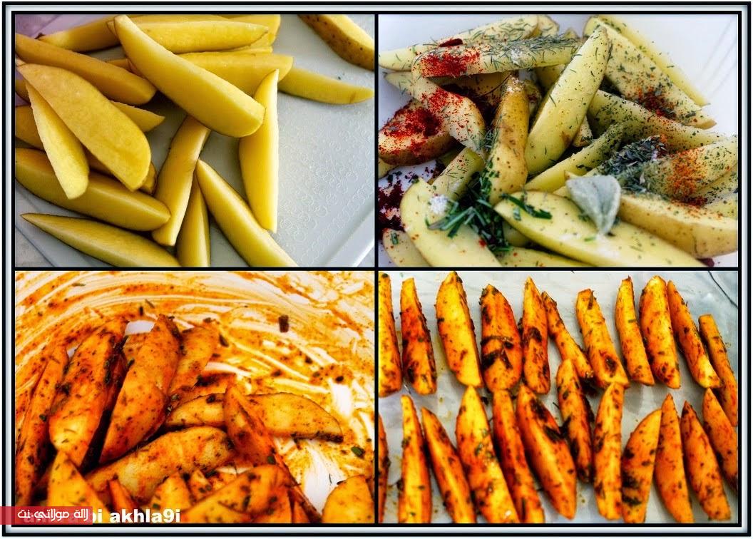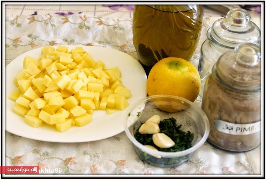 2 بطاطات مقطعيين مربعات/ثوم/قزبرمقطع/ملح/ابزار/عصير حامض/زيت الزيتون
