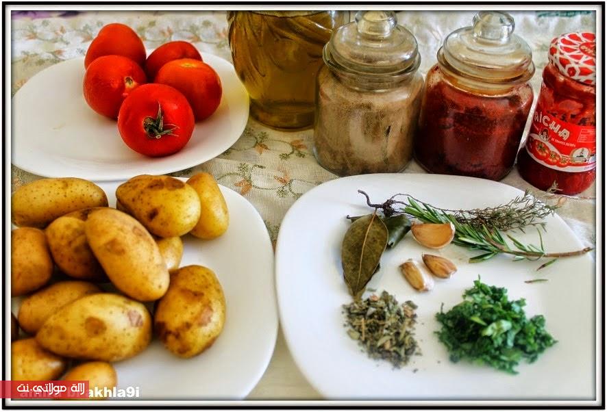 1/2 كلغ بطاطا صغييرة/4 مطيشات صغار او 3 كبار/توم/عصا موسى/ازير/زعيترة/زعتر/ربيع مكرض/ملح/بزار/تحميرة/زيت الزيتون/معيلقة مطيشة الحك