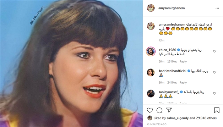 شاركت إيمي سمير غانم منشور جديد عبر حسابها الرسمي على موقع أنستغرام طالبت فيه متابعيها بالدعاء لوالدتها الفنانة دلال عبد العزيز لتجازو أزمتها الصحية التي تمر منها، مؤكدة أن حالتها سيئة جدا وكتبت إيمي : “أرجوكم الدعاء لأمي.. تعبانة جدا.. يارب” .
