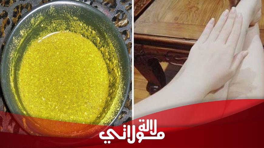 المكونات : كمية من عشبة الزاز المطحونة + ملعقة من الحناء المطحونة + ملعقة من الأرز المطحون + ملعقة من الفول المطحون + ملعقة من الحمص المطحون + ملعقتين من الكركم +كمية من عصير الليمون لخلط المكونات أو ماء الورد حسب المتوفر.